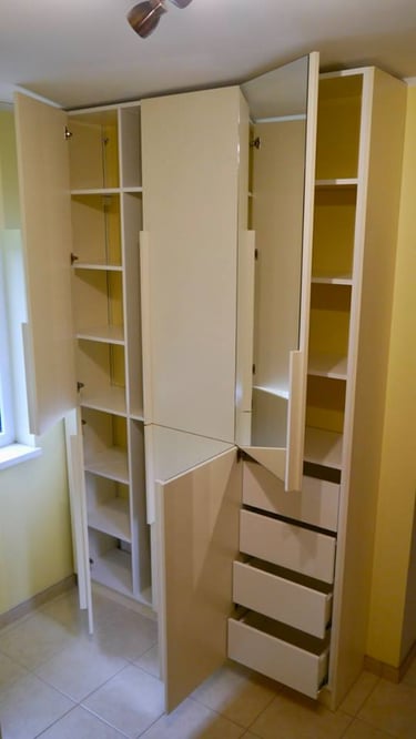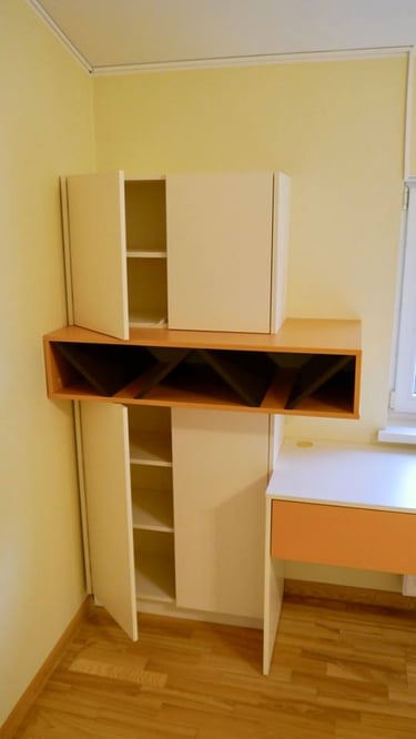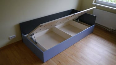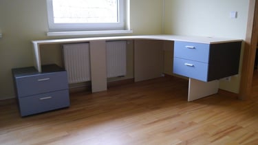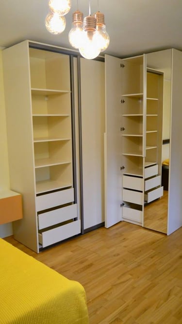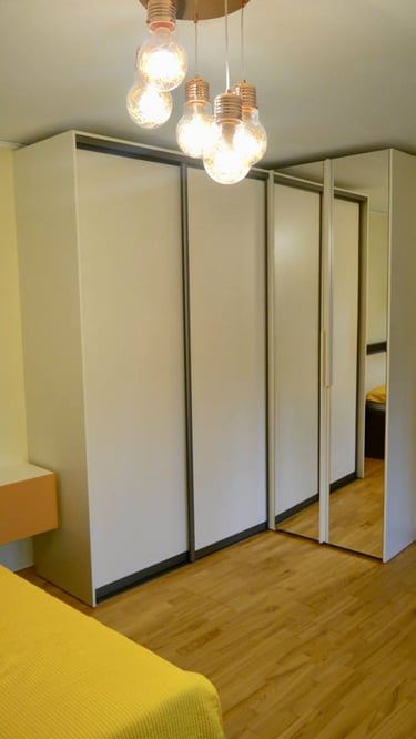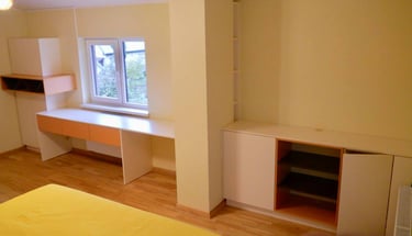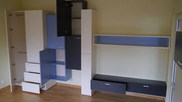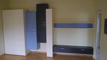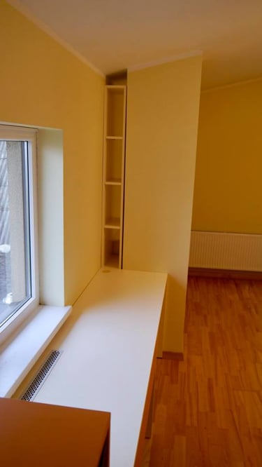 Interjero mintis- praktiškumas ir spalvos. Pagrindinė iškelta užduotis- spalvingas, žaismingas vaiko kambarys. Talpūs korpusiniai baldai miegamojo kambaryje.